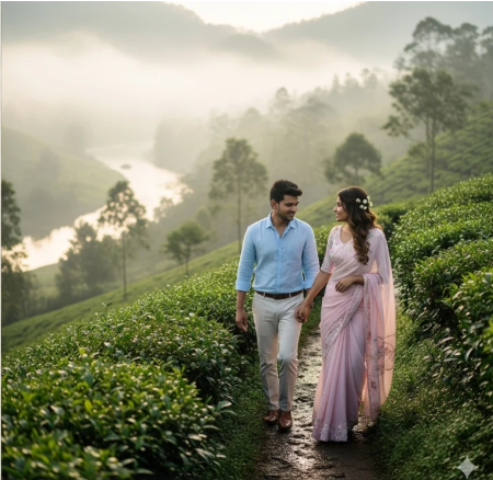 “Generate a pre-wedding scene in the misty hills of Munnar. The couple wears pastel-colored outfits. They are walking along a tea plantation path, holding hands. Soft morning fog, dewy greenery, and a calm river in the background create an intimate, natural vibe.” Pre-wedding Photo Magic With Gemini AI