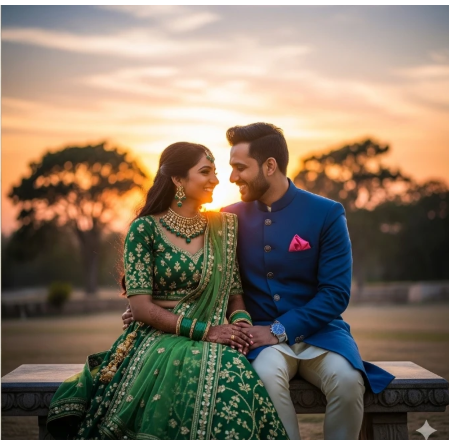 “A romantic couple sitting on a stone bench, dressed in traditional Indian attire. The woman is wearing a beautiful green lehenga choli with gold embroidery, and the man is dressed in a blue sherwani with a pink pocket square. They are smiling at each other, surrounded by a serene outdoor setting during the evening, with the sun setting in the background. The atmosphere is warm and romantic, with soft lighting highlighting the couple’s expressions. There are distant trees in the background, and the photo has a dreamy, cinematic quality.” Pre-wedding Photo Magic With Gemini AI