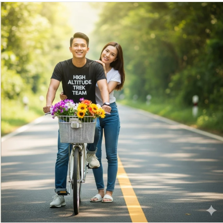 “Create a vibrant outdoor scene with a couple standing together on a road, smiling joyfully. The man is wearing a black t-shirt with the text ‘HIGH ALTITUDE TREK TEAM’ and blue jeans, riding a white bicycle with a basket filled with flowers. The woman stands behind him, leaning slightly on his back, wearing a casual white t-shirt and blue jeans, with a relaxed smile. They are surrounded by lush greenery, with a soft, blurred background showing a sunny atmosphere. The road beneath them has a yellow stripe, and the setting feels light and carefree.” Pre-wedding Photo Magic With Gemini AI