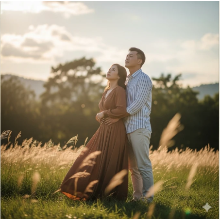 “A romantic outdoor scene of a couple in a natural setting. The woman is wearing a brown dress and looking up, while the man, dressed in a white and blue striped shirt and cream-colored pants, gazes upwards. They are standing close to each other in a grassy field with a serene and dreamy atmosphere, as soft sunlight illuminates the scene.”Pre-wedding Photo Magic With Gemini AI