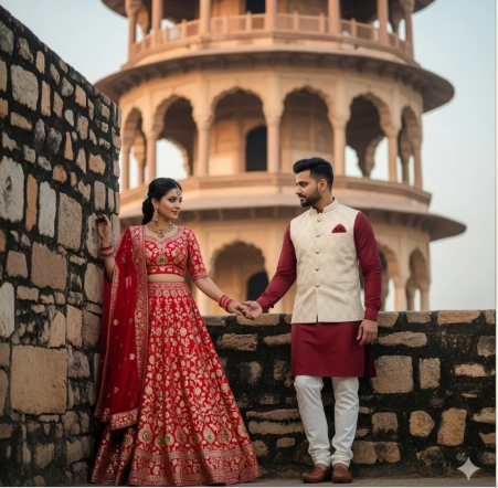 “Design a pre-wedding photoshoot for an Indian couple in a grand Rajasthani fort. The mood is regal and majestic. The bride wears a red lehenga with gold embroidery, the groom in a sherwani.” Pre-wedding Photo Magic With Gemini AI