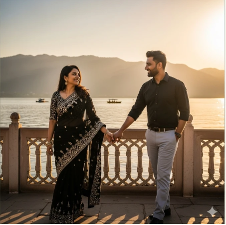 “A couple walking by the lakeside at sunset. The woman is wearing a black saree with intricate embroidery, and the man is dressed in a black shirt and light grey trousers. The woman is smiling while looking at the man, and the man is smiling back at her. They are holding hands gently while strolling along a decorative stone railing beside the water, with soft golden sunlight casting a warm glow over the serene landscape. The background features mountains and a few boats on the distant water.”Pre-wedding Photo Magic With Gemini AI