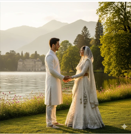 “A romantic couple dressed in elegant white traditional attire, standing close to each other, holding hands and gazing lovingly. The setting is by a serene lake with mountains in the background. The couple is surrounded by lush greenery, and a historic building can be seen in the distance. The sunlight creates a warm, glowing atmosphere. The scene is peaceful and full of love, with the natural beauty of the surroundings adding to the magic of the moment.”Pre-wedding Photo Magic With Gemini AI