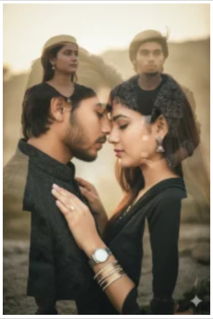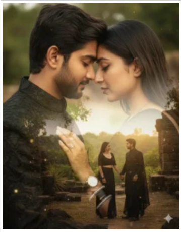 A hyper-realistic8K cinematic DSLR double exposure portrait of a couple Use the exact faces from the reference photo, do not alter their faces in any way. The primary close-up shows the couple forehead to forehead, eyes closed, in a soft romantic embrace. The man has a beard and wears a black patterned sherwani jacket, while the woman wears a black outfit with elegant bangles. Her hand rests on his chest, highlighting a wrist watch The secondary exposure shows both of them standing, face should be same. Romantic Double Exposure Couple Photo