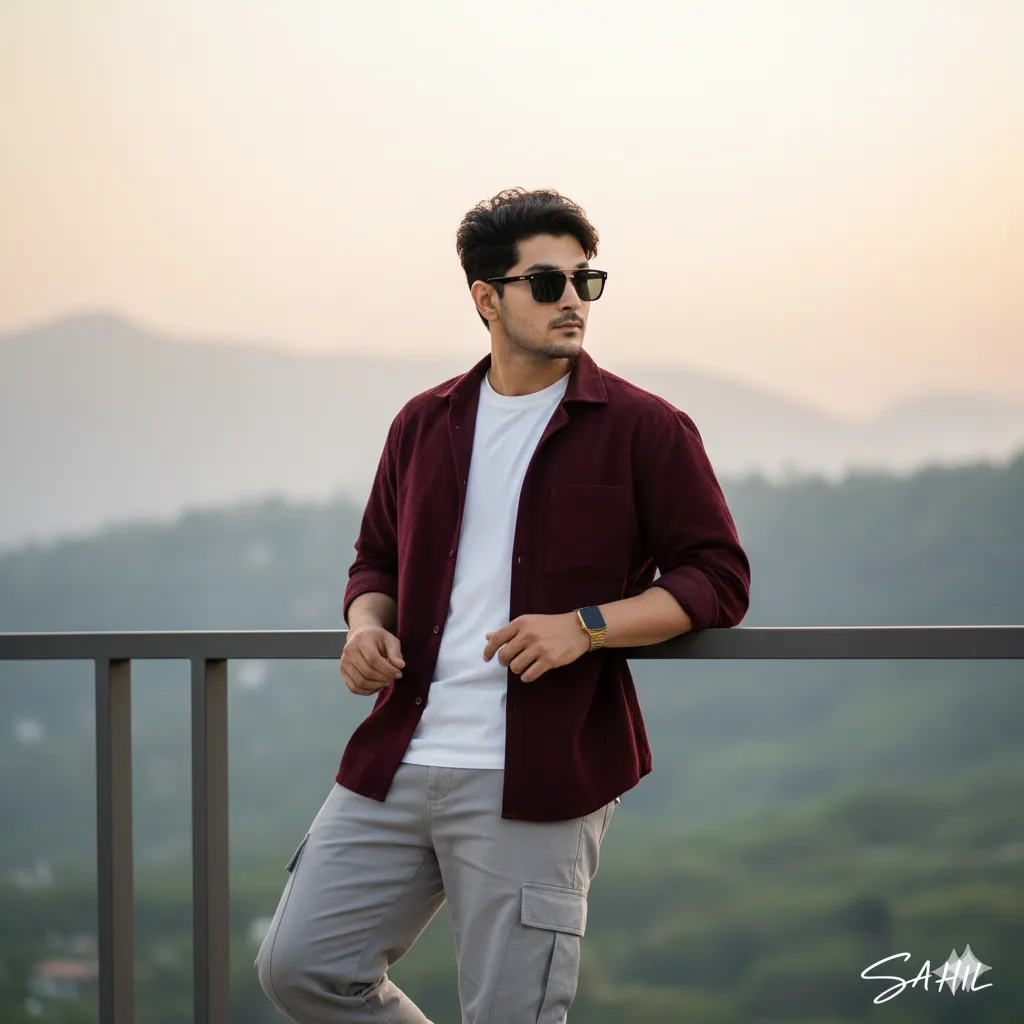 “A cinematic portrait of a stylish young man leaning casually on a terrace railing at sunset(use reference photo), wearing a deep maroon corduroy shirt with rolled-up sleeves, beige cargo pants, sunglasses, and a golden wristwatch. He gazes to the side with confidence, bathed in warm golden light. In the background, misty mountains and a pastel-colored sky fade into the horizon, creating a dreamy, cinematic atmosphere face white full body Trending Gemini Boys AI Photo Editing Prompts