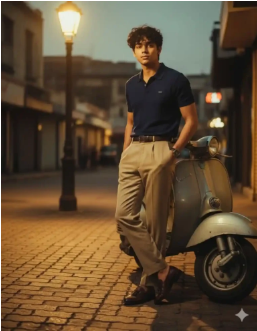 Create a retro vintage cinematic image with grainy texture using the given face. He is standing under an old streetlight at dusk, leaning against a retro scooter parked beside him. His outfit is a tucked-in polo shirt with pleated trousers, paired with classic loafers for a timeless vintage street look. The yellow streetlight reflects softly on his face, casting long dramatic shadows across the cracked pavement. The background is a quiet old city lane, dimly lit but glowing with warm tones, giving a moody cinematic film still effect. His expression is mysterious, calm, and stylish. Trending Gemini Boys AI Photo Editing Prompts