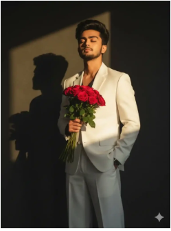 Ultra-realistic cinematic portrait of a stylish young man standing against a dark minimal background with a soft golden sunlight beam casting dramatic shadows. He is wearing a crisp, elegant white suit (blazer and wide-leg trousers) with one hand casually in his pocket and the other holding a bouquet of red roses close to his chest. His hair is voluminous and slightly tousled, styled naturally with texture. His expression is serene and confident, eyes closed, basking in the warm sunlight. The composition highlights the play of light and shadow, with a strong shadow silhouette falling on the wall behind him. The mood is romantic, artistic, and editorial – capturing both sophistication and vulnerability. Shot in high resolution, with cinematic tones, sharp details, and soft contrast. Trending Gemini Boys AI Photo Editing Prompts