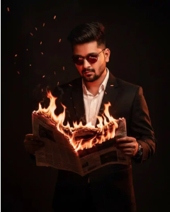 Cinematic editorial portrait of a man holding a burning newspaper, flames curling around the edges. He wears a sharp black suit. Dark background enhances the fire glow, with warm highlights on his clothes. Ultra-detailed, high-contrast lighting Trending Gemini Boys AI Photo Editing Prompts