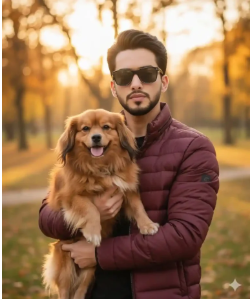 Ultra-realistic 8K cinematic portrait of a stylish young man standing outdoors with his fluffy dog during golden hour. The man has well-groomed hair styled back, wearing black sunglasses and a maroon quilted puffer jacket with a zipper, giving a modern and confident vibe. He is holding his dog close, a fluffy brown long-haired dog with a happy expression and tongue slightly out. The sunlight filters through autumn-colored trees in the background, creating a warm golden bokeh effect. Detailed textures of the jacket’s fabric, the dog’s soft fur, and the man’s beard stubble are sharply visible. Natural depth of field, perfect skin detailing, photorealistic lighting, cinematic tones, high dynamic range, hyper-detailed 8K photography aesthetic.” 100% face matching Trending Gemini Boys AI Photo Editing Prompts