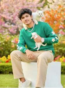 Reference photo included, ultra-realistic editorial photo of a 18 year old boy (face from reference photo, unchanged), He wears a green sweatshirt with white flower prints on the sleeves, beige wide pants, and white chunky sneakers with yellow accents., head tilted slightly with a gentle smile. Background mix flower tree and boy sitting white box and boy sholder White cat And boy hand white cat baby and gle me daimond chen and diomond wat Trending Gemini Boys AI Photo Editing Prompts