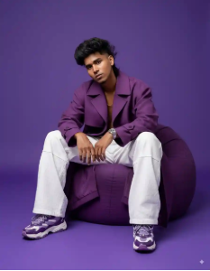 Hyper-realistic cinematic full-body fashion photoshoot of the uploaded person (age 25, height 5’5″), with the exact face and medium-length wavy hairstyle from the uploaded image, perfectly styled. Seated on a deep purple bean bag, leaning slightly forward with elbows on knees, wearing bold all-purple oversized streetwear: structured trench coat, wide white pants, chunky sneakers, silver watch. Solid purple background. Face looking directly at the camera with subtle confident expression. Dramatic studio lighting emphasizing textures and folds. Adidas campaign editorial vibe with cinematic depth of field and powerful drip aura. Trending Gemini Boys AI Photo Editing Prompts