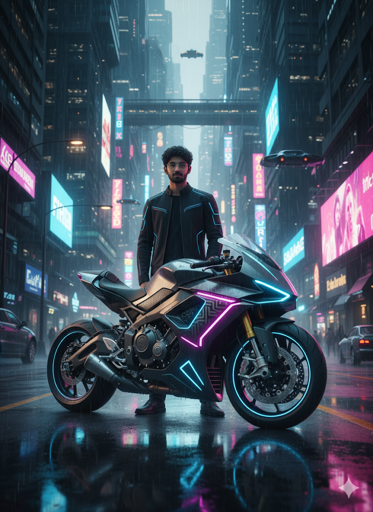 “Futuristic AI-designed bike with neon lights, sci-fi city background, hyper-detailed” Trending Google Gemini Nano Banana Prompts